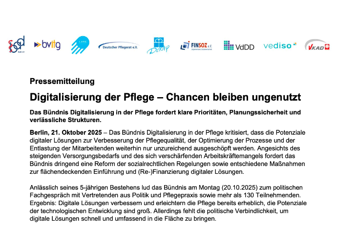 Das Verbändebündnis „Digitalisierung in der Pflege“ fordert von einer neuen Bundesregierung, dass die Pflegebranche innerhalb der Gesundheitswirtschaft einen höheren Stellenwert einnimmt. In der neuen Legislaturperiode muss dafür gesorgt werden, dass mehr Verlässlichkeit bei den Rahmenbedingungen, der Finanzierung und bei der Fristsetzung und Realisation von Gesetzen zur Digitalisierung in der Pflege geschaffen wird.